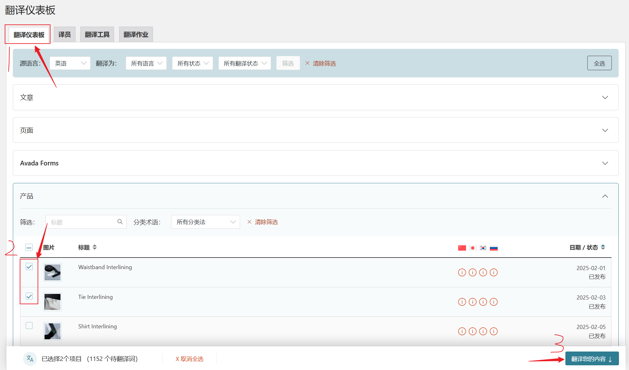 1. 在 WPML 中选择文章 / 页面 / 产品, 翻译任务仪表盘勾选需要翻译的任务