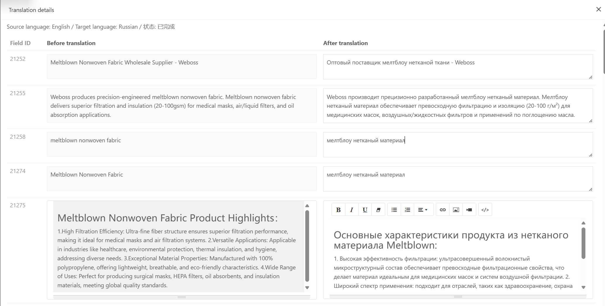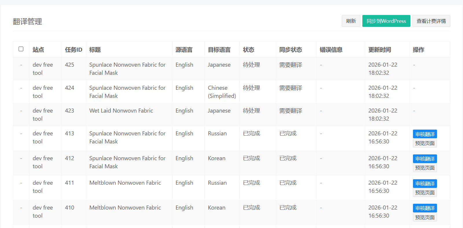 • 翻译完成可以查看译文内容,审核状态可编辑译文和同步译文到网站