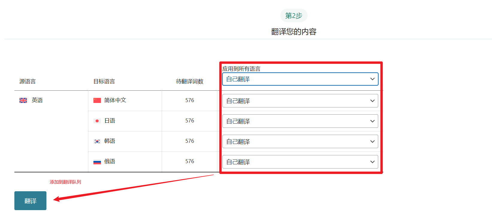 2. 应用【选择我自己翻译】任务送入 WPML 翻译队列(Translation Queue)