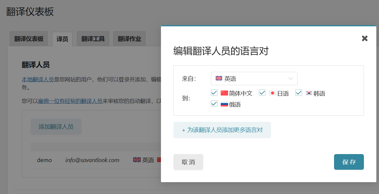 • 后台WPML配置一名译员并分配需要翻译的语言