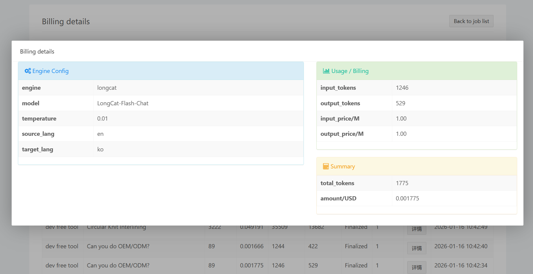 进入消费明细页面(通常在翻译任务相关入口)查看: